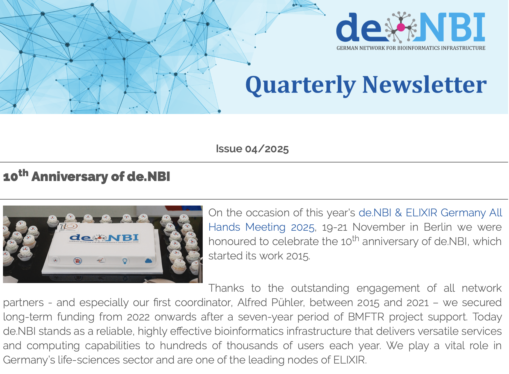 The new de.NBI Quarterly Newsletter, has been published. It reports on main de.NBI and ELIXIR-DE activities since September 2025.